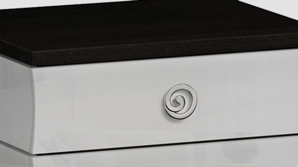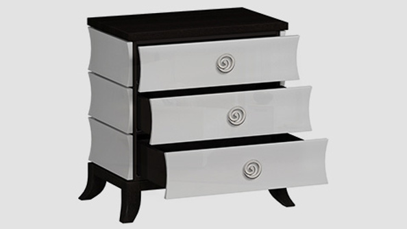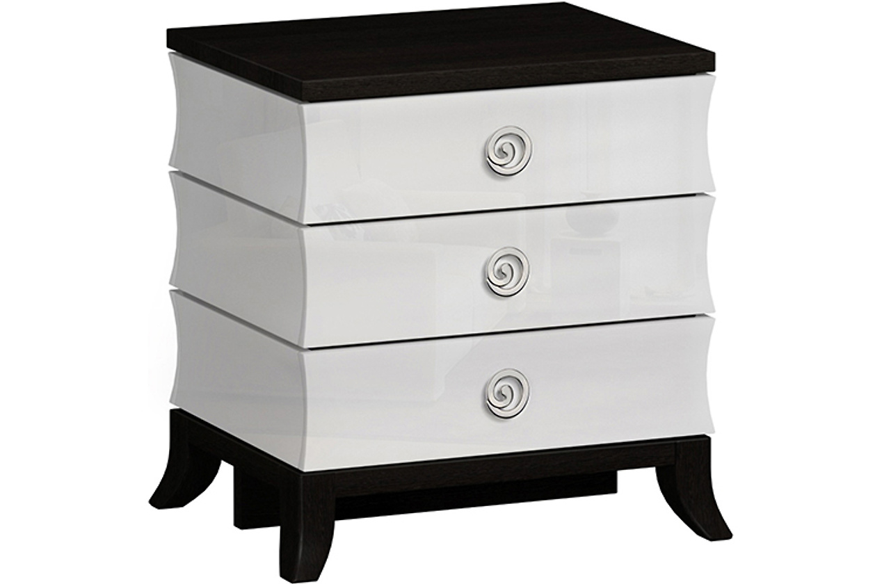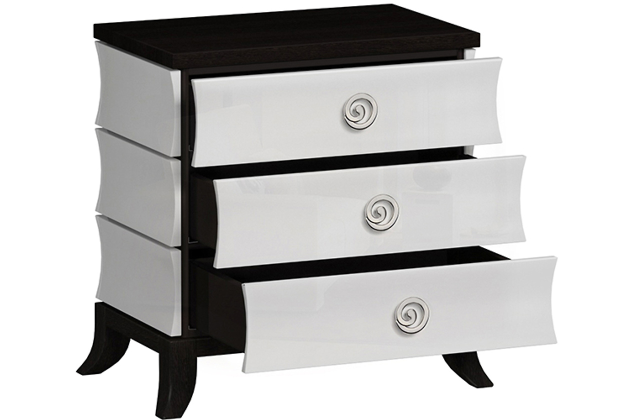 Прикроватная тумба «Эвелин» – изящное украшение спальни и логическое продолжение одноименной коллекции. Несмотря на сдержанный образ, эта тумба не выглядит обыденно: стильная комбинация черного и белого, оригинальная форма и красивая фурнитура заставляют модель «звучать».